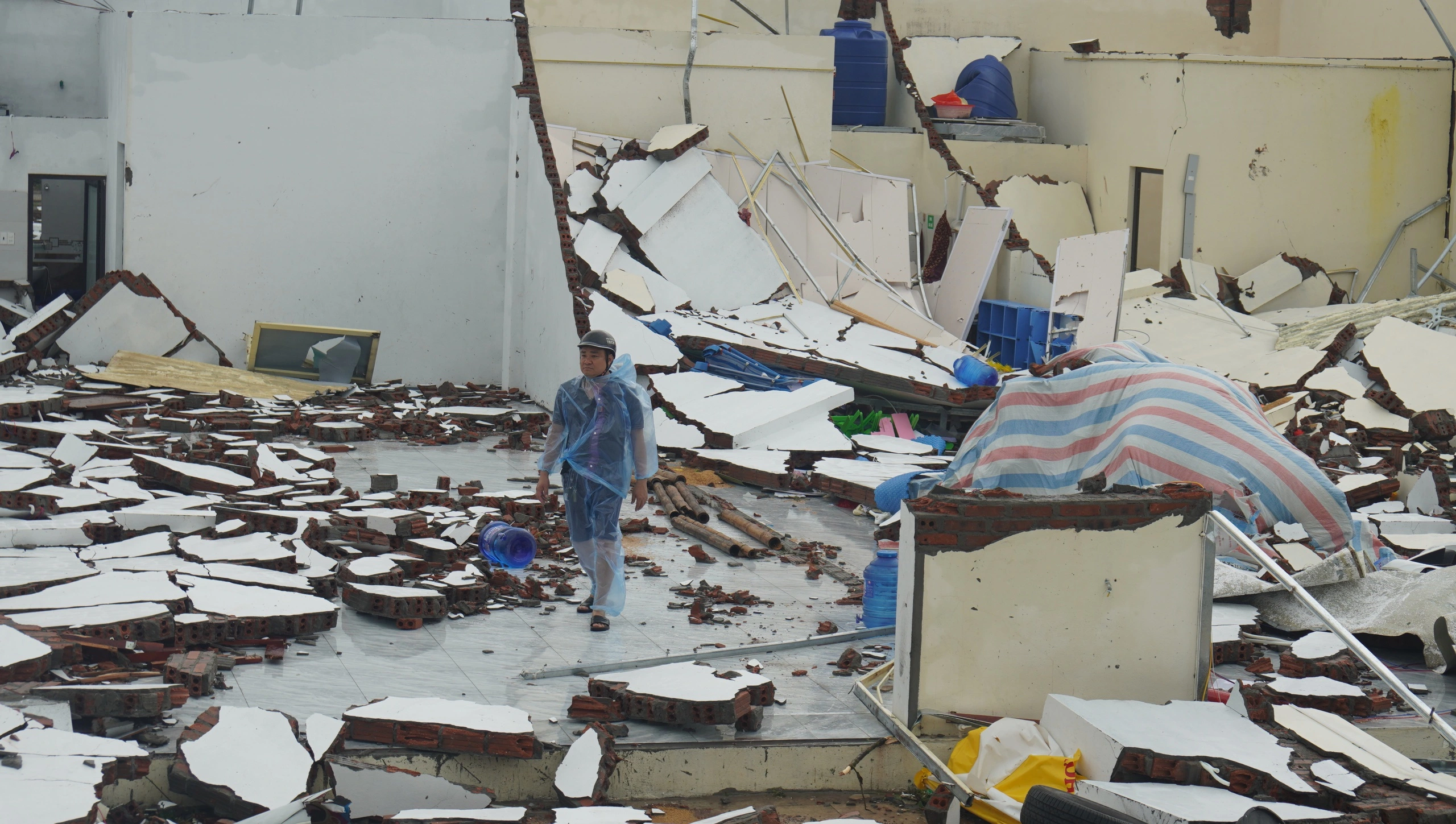 Người dân thất thần nhìn nhà cửa sau trận lốc xoáy chỉ còn là đống đổ nát - ẢNH: MINH HẢI