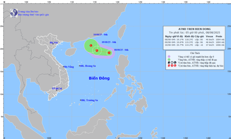 Bản đồ dự báo quỹ đạo và cường độ áp thấp nhiệt đới lúc 5 giờ sáng 8/8/2025. (Ảnh: Trung tâm Dự báo khí tượng thủy văn quốc gia)
