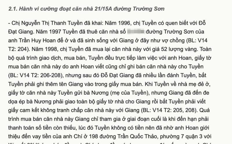 Theo kết luận điều tra, bà Hằng (khi đó tên Tuyền) khai, đã nhiều lần bị Giang đánh, ép thêm tên y vào giấy mua bán nhà. Giang còn tìm đến, gây sức ép buộc mẹ bà Hằng phải đưa ra giấy tờ căn nhà, ép bà Hằng viết xác nhận không có tranh chấp.