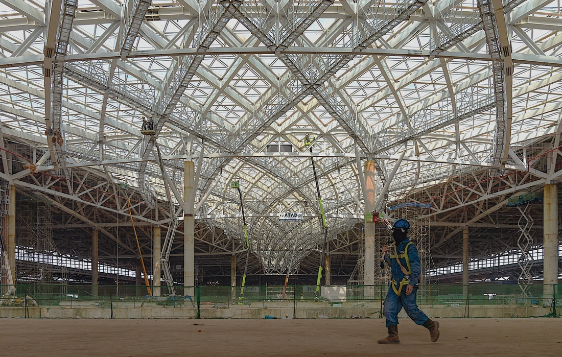 Chỉ tay lên mái vòm trung tâm, nơi các công nhân đang làm việc ở độ cao hàng chục mét, ông Sơn cho biết đây là hạng mục phức tạp nhất của toàn dự án. Lần đầu tiên, một hệ mái thép khổng lồ không được lắp dựng thủ công từng cấu kiện trên cao mà được lắp ráp hoàn chỉnh dưới mặt đất rồi nâng đồng loạt lên vị trí thiết kế.