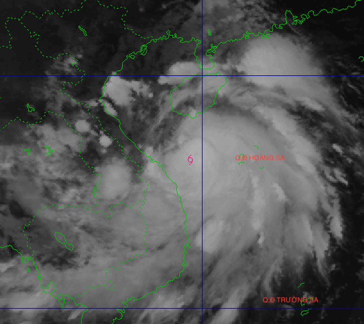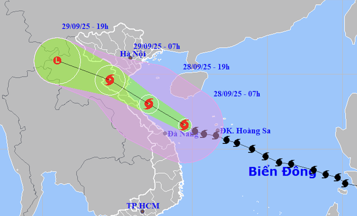 Lúc 7h sáng 28-9, tâm bão Bualoi đang ở trên vùng biển Quảng Trị - Đà Nẵng, cách Huế khoảng 170km về phía đông, cách bắc Quảng Trị khoảng 350km về phía đông đông nam.