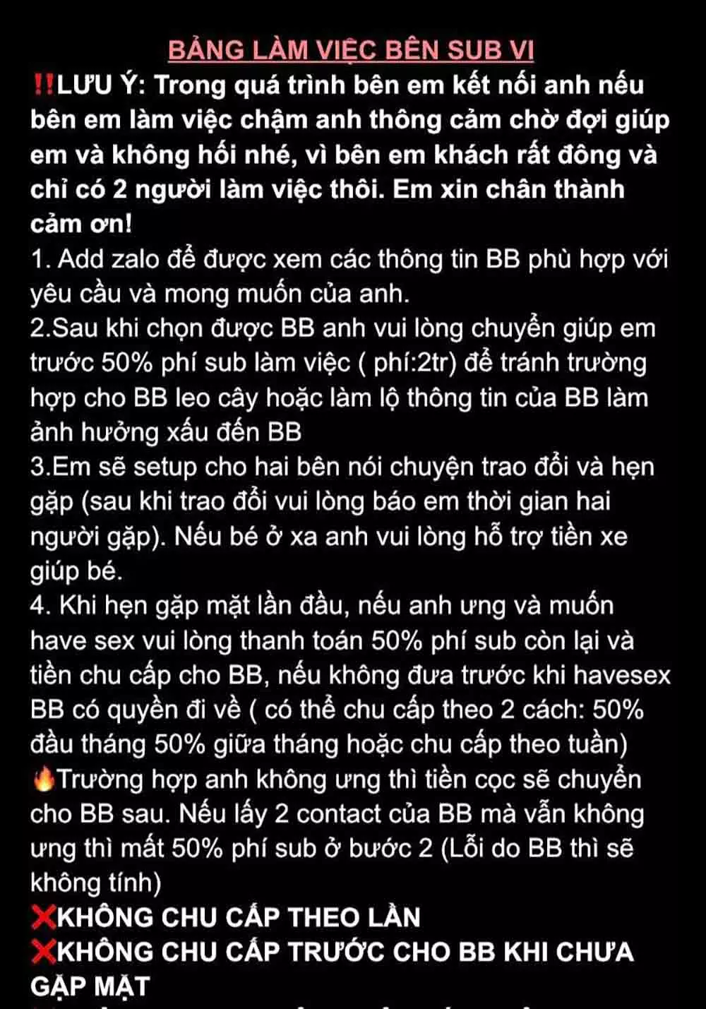 Từ thông tin trong các nhóm kín, những khách có nhu cầu liên hệ qua mạng Zalo, Viber, Telegram… với Vy. Theo quy định Vy đặt ra, khách phải chuyển 2 triệu đồng gọi là tiền phí làm việc để được Vy cho xem hình ảnh, thông tin của “sugar Baby”. Sau đó, Vy mới sắp xếp cho hai bên trao đổi, gặp mặt.