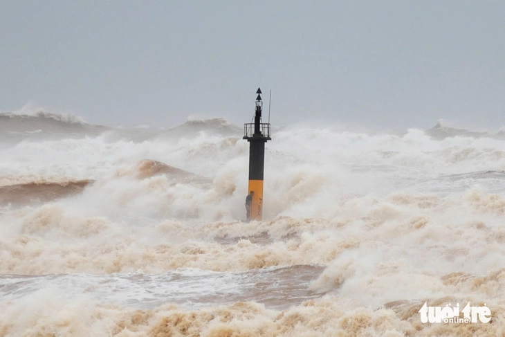 Một thuyền viên còn lại đang bám vào phao tiêu ở phía ngoài biển sáng 28-9 giữa sóng to, mưa và gió - Ảnh: HOÀNG TÁO