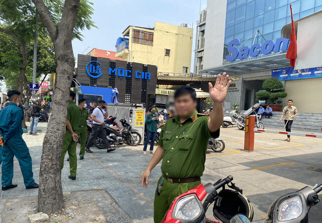 Phía trước tòa nhà, nhiều cảnh sát phong tỏa, không cho người lạ đến gần; đồng thời nhiều Công an tiến vào bên trong để thực hiện khám xét.
