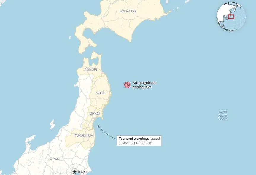 Theo cảnh báo của Cơ quan Khí tượng Nhật Bản, một trận sóng thần cao tới 3 mét có thể tấn công khu vực này. Ngoài cảnh báo sóng thần ở tỉnh Iwate, phía Bắc tỉnh Aomori và vùng Đông Nam tỉnh Hokkaido, cơ quan này cũng đưa ra cảnh báo sóng thần nhẹ hơn ở khu vực bờ biển tỉnh và tỉnh Fukushima - phía Nam tâm chấn động đất.
