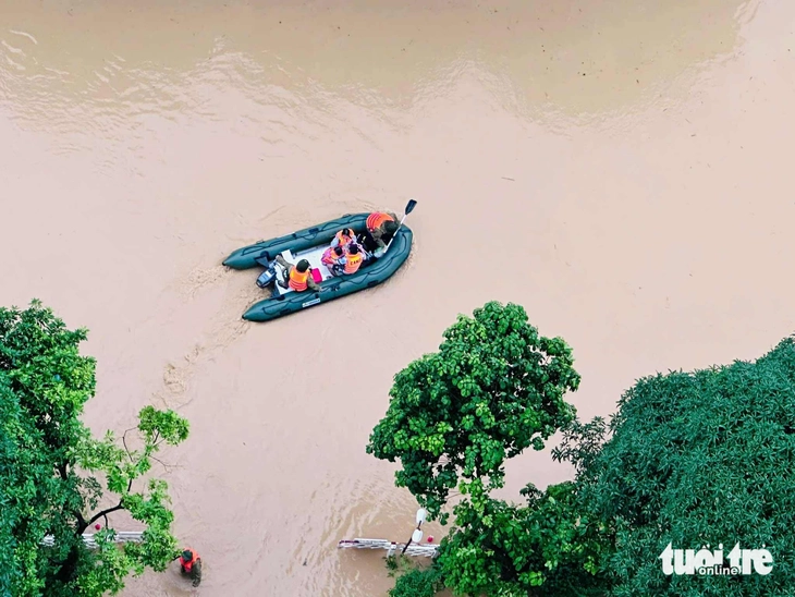 Đến trưa 7-10, lực lượng Công an tỉnh Thái Nguyên vẫn đang tích cực đưa người dân bị mắc kẹt ở những nơi ngập lụt sâu đến nơi an toàn - Ảnh: HÙNG MINH