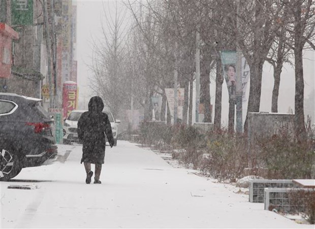 Tuyết phủ trắng trên đường ở thành phố Jeonju, phía Nam Seoul, Hàn Quốc. (Ảnh: Yonhap/TTXVN)
