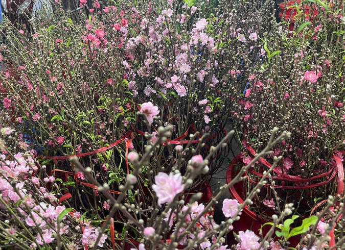 Nhiều cửa hàng kinh doanh hoa tươi nhập hoa đào Nhật Tân, đào rừng Tây Bắc phục vụ người mua chơi Tết sớm. Ảnh: Thái Bảo