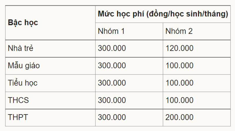 Học phí nhóm 1 (thành thị) áp dụng cho học sinh ở các quận, TP Thủ Đức; nhóm 2 (nông thôn) dành cho học sinh tại các huyện Bình Chánh, Hóc Môn, Củ Chi, Nhà Bè và Cần Giờ.
