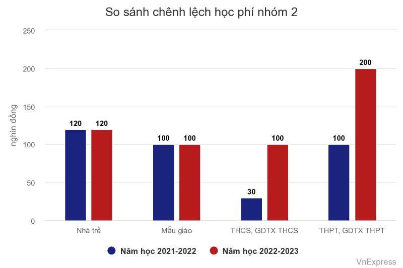 Ở nhóm 2, mức học phí cũng tăng mạnh nhất ở bậc THCS, từ 30.000 đồng/tháng lên 100.000 đồng/tháng.