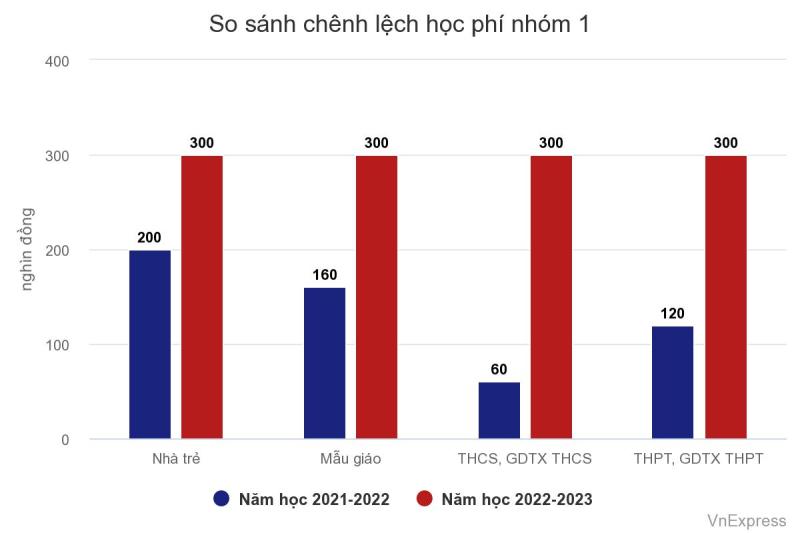 Ở nhóm 1, học phí tăng mạnh nhất ở bậc THCS, từ 60.000 đồng/tháng lên 300.000 đồng/tháng.