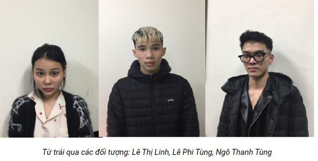 3 đối tượng gồm: Lê Thị Linh (SN 2004, trú tại TX. Bỉm Sơn, Thanh Hóa); Lê Phi Tùng (SN 2004, trú tại Cầu Giấy, Hà Nội) và Ngô Thanh Tùng (SN 2002, trú tại Bắc Từ Liêm, Hà Nội).