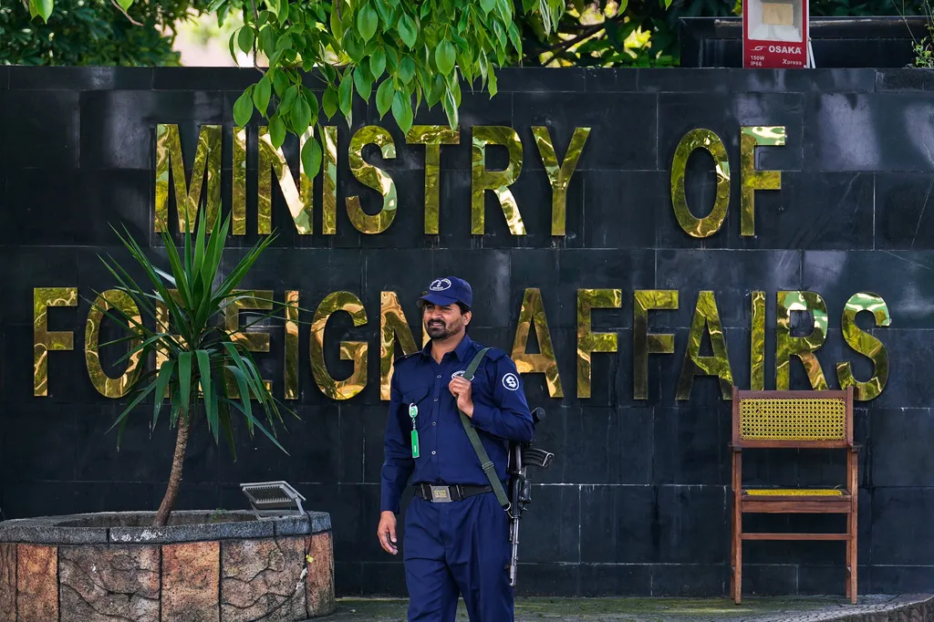 Nhân viên an ninh đứng gác tại cổng chính Bộ Ngoại giao Pakistan ở Islamabad trước thềm đàm phán Mỹ - Iran, ngày 9/4/2026. (Ảnh: AP)