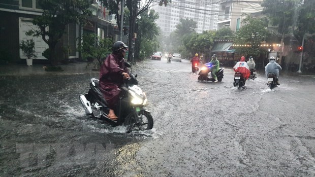 Tuyến đường Lê Tấn Trung, quận Sơn Trà, thành phố Đà Nẵng, nhiều đoạn nước ngập sâu khiến phương tiện giao thông gặp khó khăn khi di chuyển. (Ảnh: Văn Dũng/TTXVN)