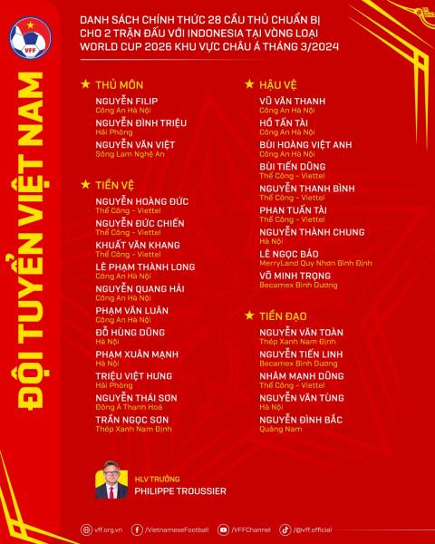 Tối 18/3, HLV Troussier đã chốt danh sách 28 cầu thủ ĐT Việt Nam lên đường sang Indonesia chuẩn bị cho trận đấu tại vòng loại thứ 2 World Cup 2026 khu vực châu Á. Theo đó, 5 cái tên bị HLV Troussier gạch tên là Công Phượng, Duy Mạnh, Hai Long, Giáp Tuấn Dương và Tiến Anh.