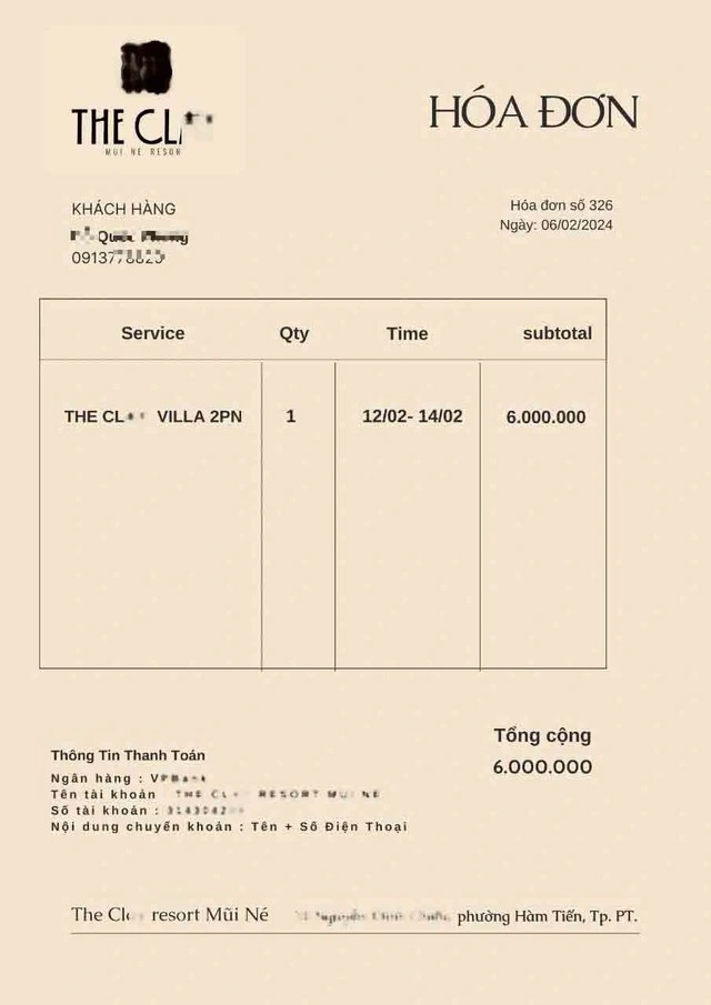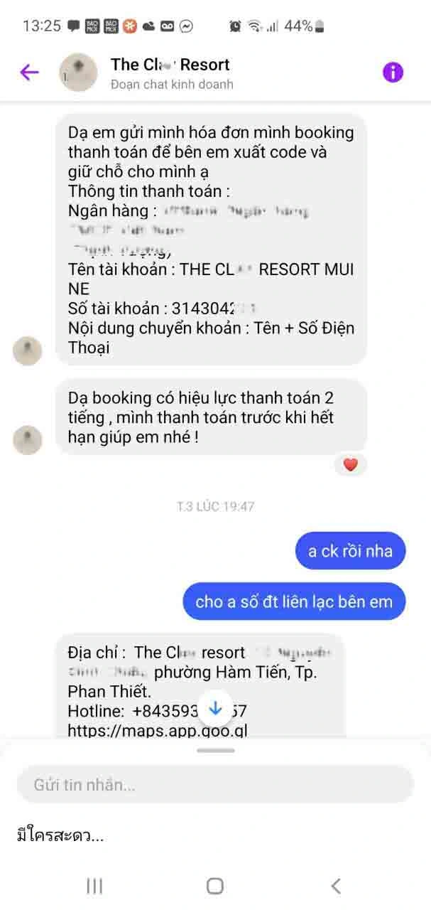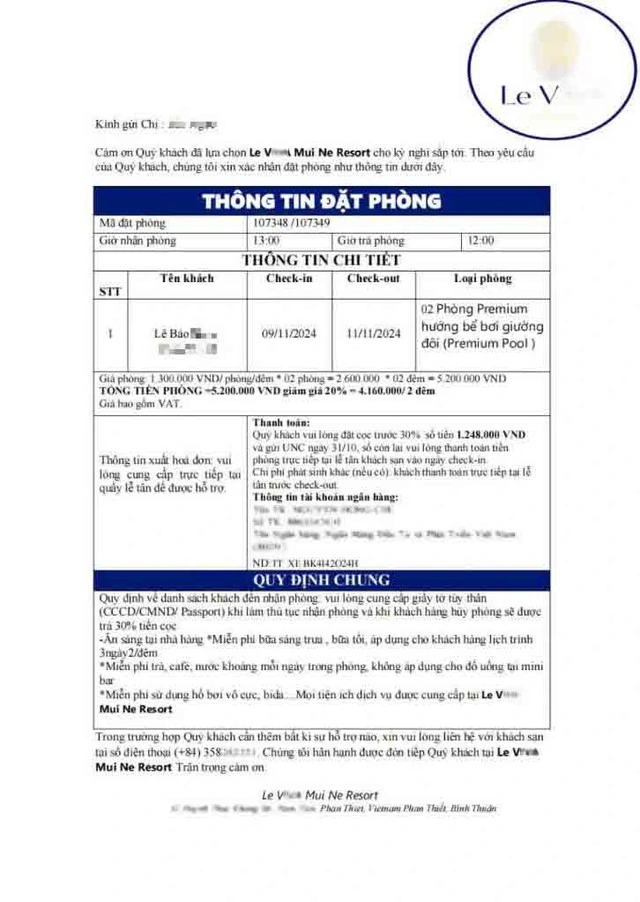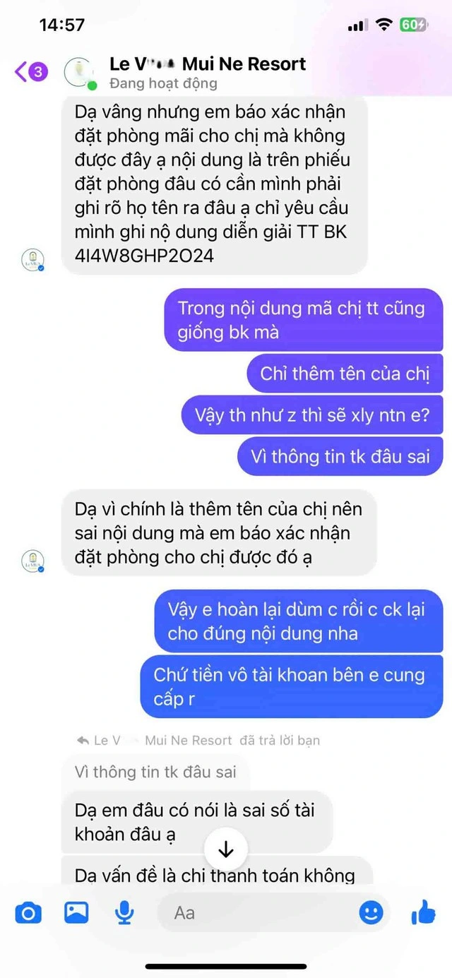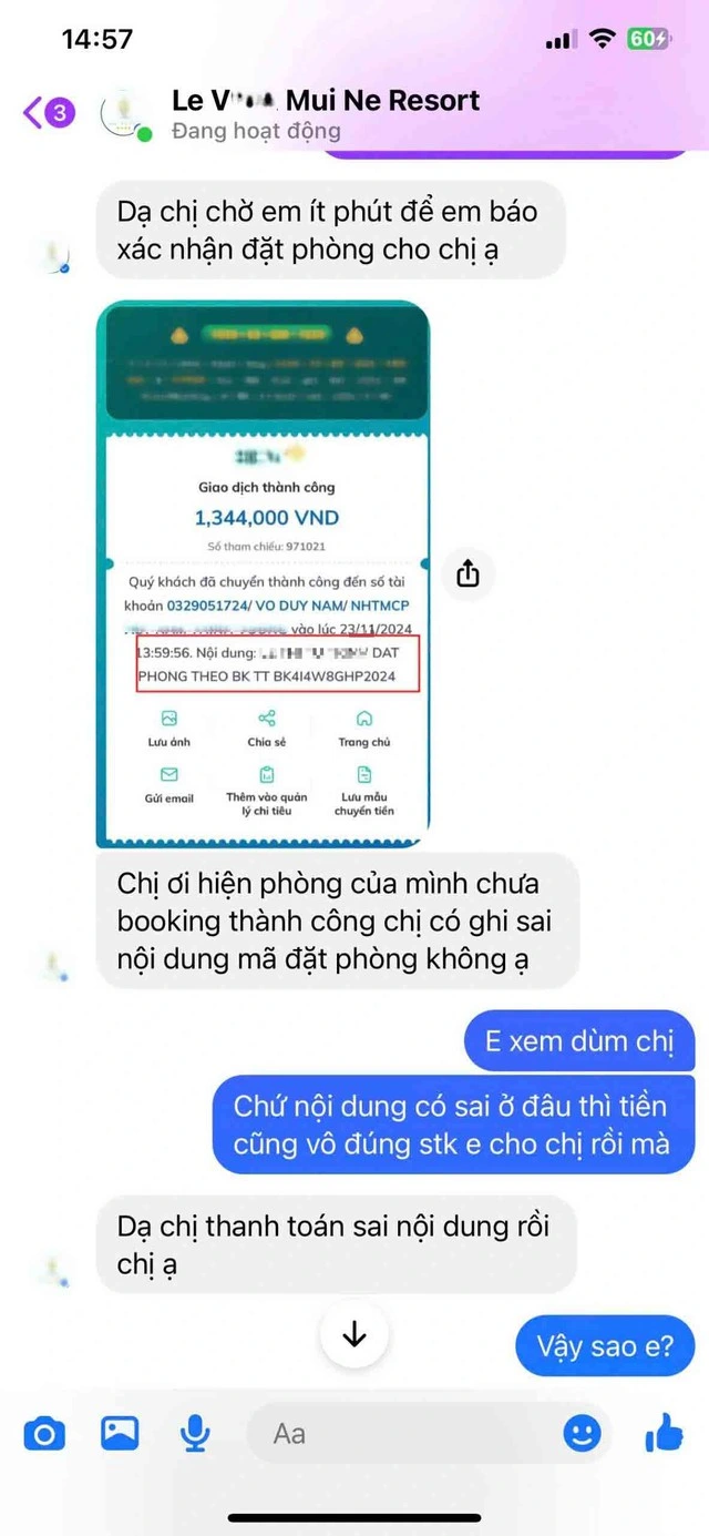 Hay chị L.T.Tr (ở TP.HCM) chuyển tiền 1,3 triệu đồng để đặt phòng thông qua fanpage "Le.V Mui Ne Resort", tuy nhiên sau khi chuyển tiền cọc thì đối tượng nói rằng đặt phòng không thành công vì chị Tr. ghi sai nội dung chuyển khoản "TT BK 4l4W8GHP2O24" trên phiếu đặt phòng, khi chị Tr. ghi thêm tên của mình cùng nội dung chuyển khoản phía resort yêu cầu nhưng cũng không được chấp nhận và đề nghị chị Tr. tiếp tục đặt cọc để nhận tiền hoàn về...
