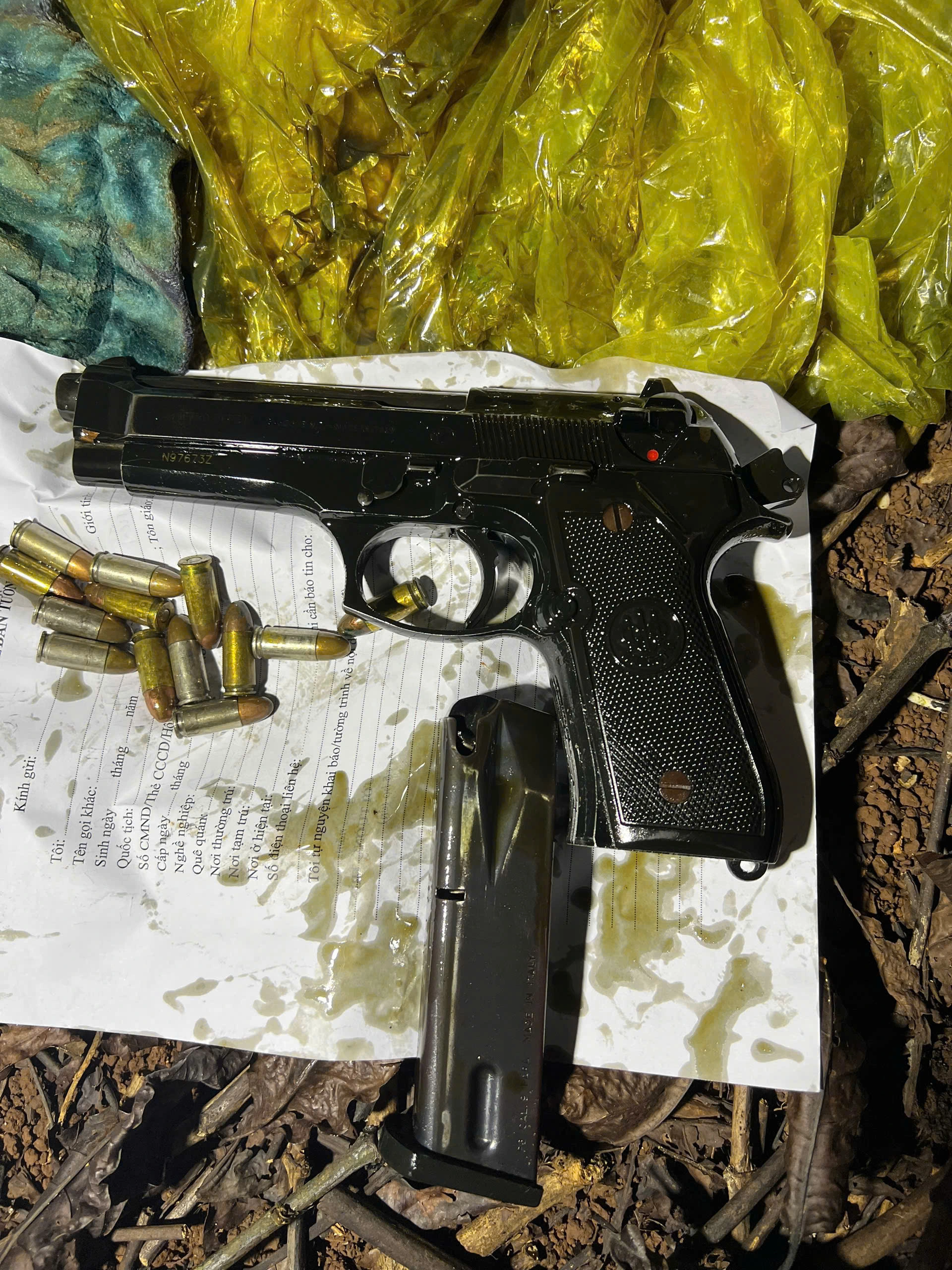 Bình "Kiểm" được bị cáo Vũ tặng Khẩu súng Beretta và 13 viên đạn, sau đó được bị cáo Hoàng Anh giấu tại khu vườn ở Lâm Đồng - ẢNH: C.T.V