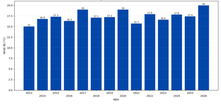 Nhiệt độ tháng 2 tại trạm Phù Liễn, TP Hải Phòng từ năm 2013 đến 2026. (Nguồn: Đài Khí tượng thuỷ văn TP Hải Phòng)