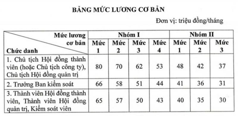 Mức lương cơ bản của chủ tịch các doanh nghiệp Nhà nước được phân ở hai nhóm, dao động từ 37 triệu đồng/người/tháng đến 80 triệu đồng/người/tháng. Mức lương cơ bản của trưởng ban kiểm soát doanh nghiệp Nhà nước dao động từ 31 triệu đồng/người/tháng đến 66 triệu đồng/người/tháng.