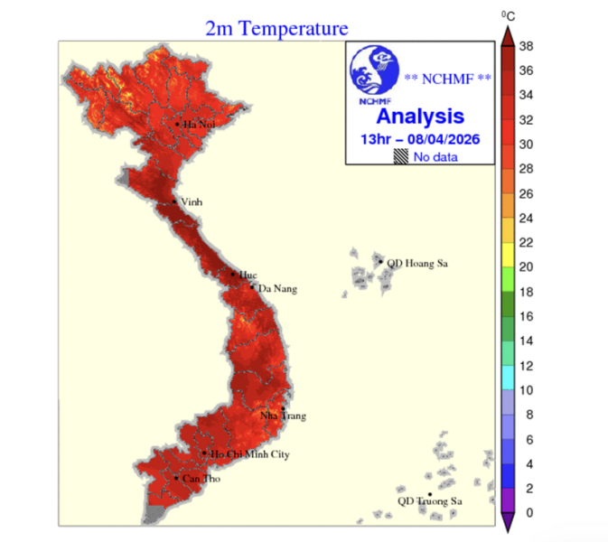 Bản đồ phân bố nhiệt độ lúc 13 giờ chiều ngày 8/4/2026
