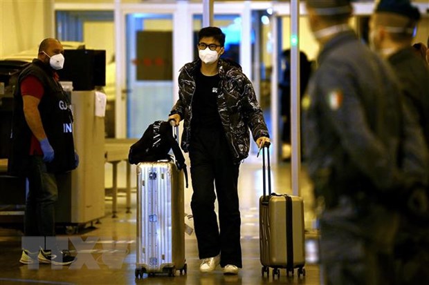 Du khách Trung Quốc đeo khẩu trang phòng COVID-19 rời khỏi sân bay quốc tế Rome-Fiumicino, gần Rome, ngày 29/12/2022. (Ảnh: AFP/TTXVN)