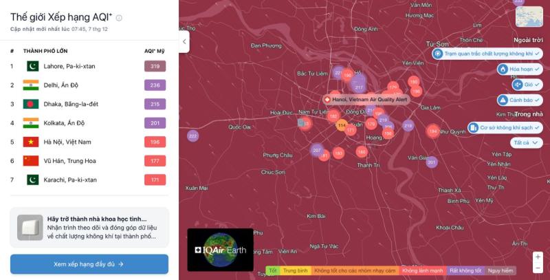 Lúc 7h45 sáng nay (7.12), IQAir xếp Hà Nội là thành phố ô nhiễm thứ 5 trên thế giới với chỉ số AQI là 196.