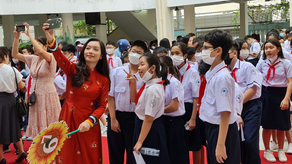Học sinh TP.HCM trong ngày khai giảng năm học mới. Nhiều phụ huynh cho biết: lịch nghỉ Tết của học sinh TP.HCM năm nay chưa hợp lý - Ảnh: HOÀNG HƯƠNG