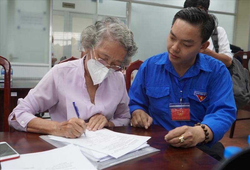 Bà Ngô Xuân Thu được cán bộ hướng dẫn bổ sung giấy tờ để làm thủ tục nhận tiền bồi thường. Ảnh: Phương Ngân