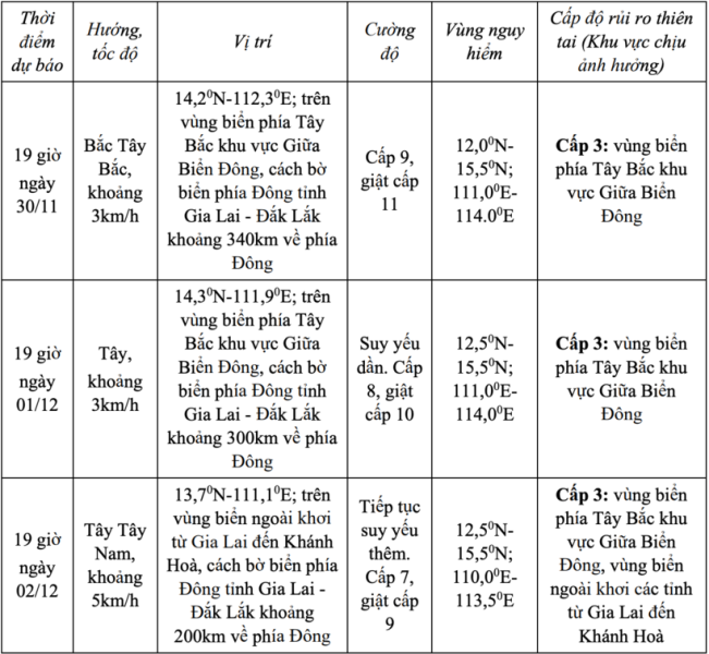 Hồi 19h ngày 29/11, vị trí tâm bão ở vào khoảng 13,5 độ Vĩ Bắc; 112,0 độ Kinh Đông, trên vùng biển phía Tây Bắc khu vực Giữa Biển Đông.
