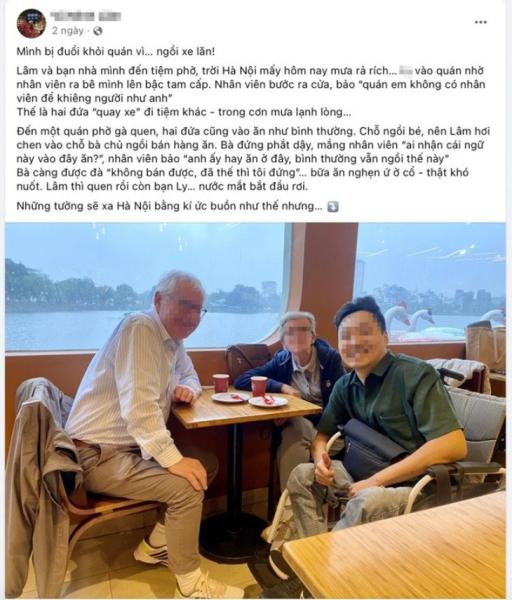 Theo nội dung bài đăng trên Facebook, tài khoản V.M.L, với gần 150.000 lượt theo dõi cho biết anh cùng bạn gái đến một quán phở Hà Nội. Do phải ngồi xe lăn, nên anh L. đã nhờ nhân viên bê qua bậc tam cấp. Tuy nhiên, người này từ chối và trả lời "quán em không có nhân viên để khiêng người như anh".