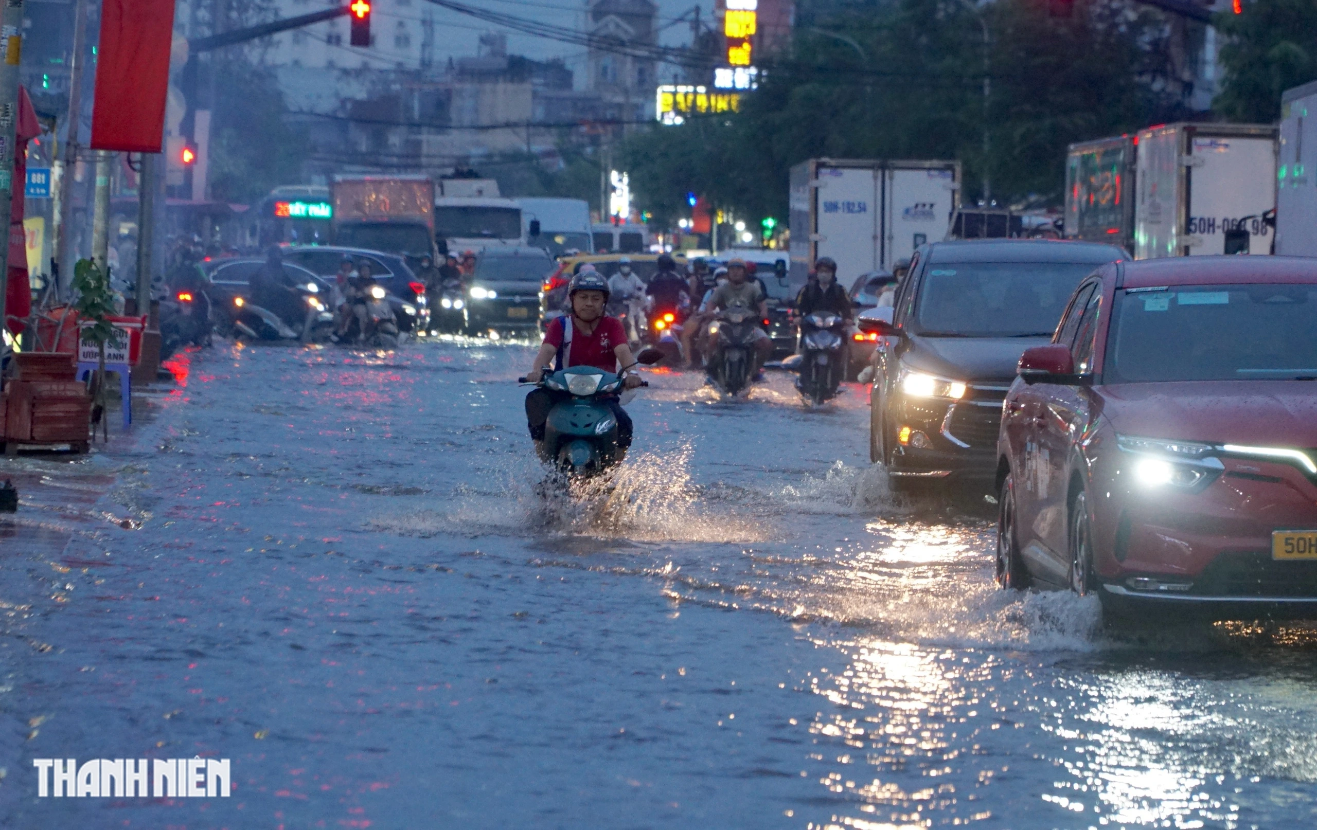 Trên đường Phạm Hữu Lầu, nước ngập hầu hết cả tuyến đường, mực nước lên đến hơn đầu gối. Ở đường Trần Xuân Soạn cũng vậy, nước ngập sâu, thường tập trung tại đoạn gần cầu Tân Thuận, người dân đi lại rất khó khăn.