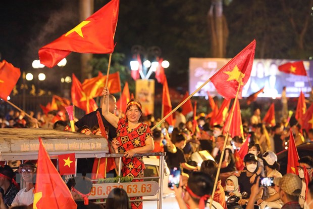Người dân Thủ đô đổ ra đường chúc mừng chiến thắng của đội tuyển U23 Việt Nam tại SEA Games 31. (Ảnh: Khánh Hòa/TTXVN)