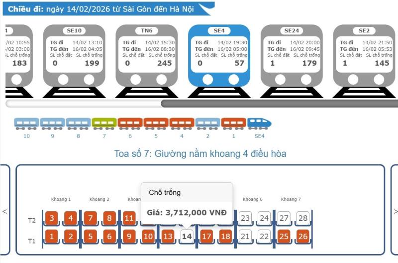 Theo ghi nhận, trên tuyến TPHCM - Hà Nội, giá vé thấp nhất khoảng 2,47 triệu đồng/vé ngồi mềm điều hòa đối với tàu TN4, TN6 đi ngày 14.2.2026 (tức 27 Tết).