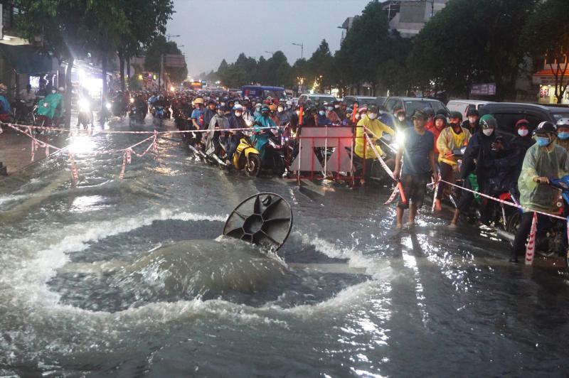Trong đó, tại đại lộ Phạm Văn Đồng đoạn giao Tô Ngọc Vân, mưa lớn khiến cống thoát nước không kịp, đẩy bật nắp cống phun trào ngược lên mặt đường.