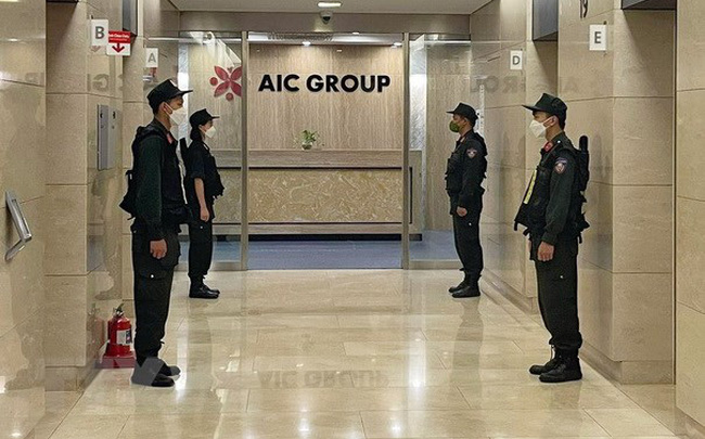Lực lượng Cảnh sát điều tra làm nhiệm bảo vệ trong quá trình khám xét tại trụ sở Công ty AIC, 69 phố Tuệ Tĩnh, ngày 29/4/2022. Ảnh: Phạm Kiên/TTXVN