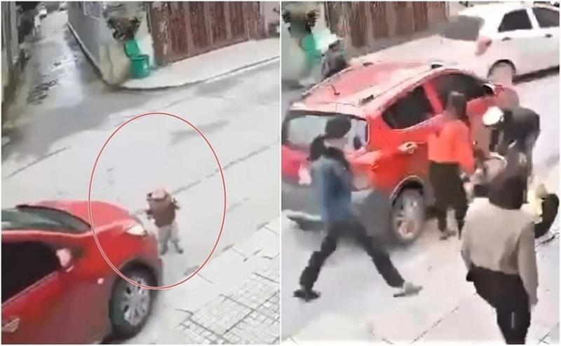 Ít giây sau cháu bé đứng dậy, tuy nhiên người phụ nữ cầm lái ô tô không thấy cháu bé phía trước nên lái xe chạy, tông trúng và cuốn cháu bé vào gầm xe.