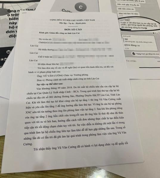 Ngày 10/2/2022, chị H đã viết đơn tố cáo ông Cường với các nội dung trên và cung cấp các bằng chứng liên quan đến Công an tỉnh Lào Cai.