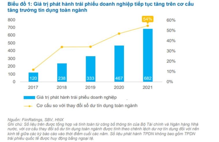 Năm qua, quy mô huy động qua kênh trái phiếu doanh nghiệp trong nước đạt 682 nghìn tỷ. Đây là kênh huy động vốn rất lớn, bởi con số này chiếm 54% của thay đổi số dư tăng trưởng tín dụng mới toàn hệ thống trong năm 2021, vượt mức thay đổi số dư tăng trưởng tín dụng mới trung và dài hạn của hệ thống ngân hàng thương mại Việt Nam.