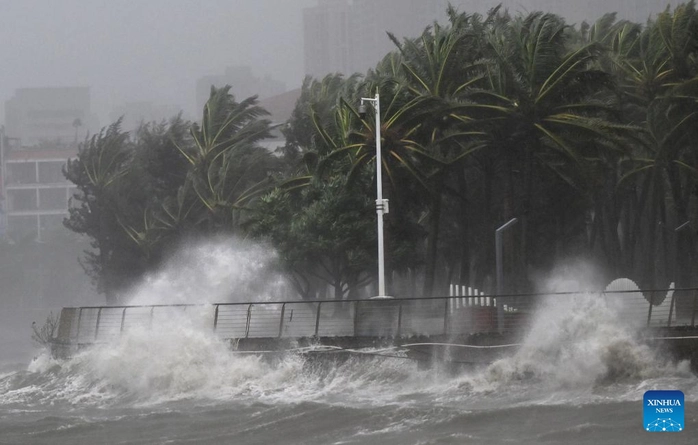 Bão Mantro mang theo sóng, gió dữ dội ven biển TP Hải Khẩu, tỉnh Hải Nam. Ảnh: Tân Hoa Xã