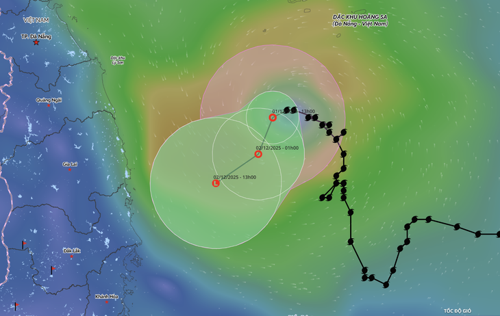 Đến 1h sáng 2-12, tâm áp thấp nhiệt đới cách bờ biển phía đông tỉnh Gia Lai-Đắk Lắk khoảng 200km về phía đông, cường độ áp thấp nhiệt đới lúc này mạnh cấp 6, giật cấp 8.