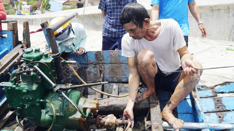 Khi thấy chiếc thuyền của mình được lực lượng trục vớt kéo vào gần đền bờ, vợ chồng ông Phạm Văn Bình (58 tuổi, thôn Lý Hòa) chạy vội xuống biển để kiểm tra. Khi con thuyền bắt đầu lộ ra dần trên mặt nước, hai vợ chồng không cầm được nước mắt.