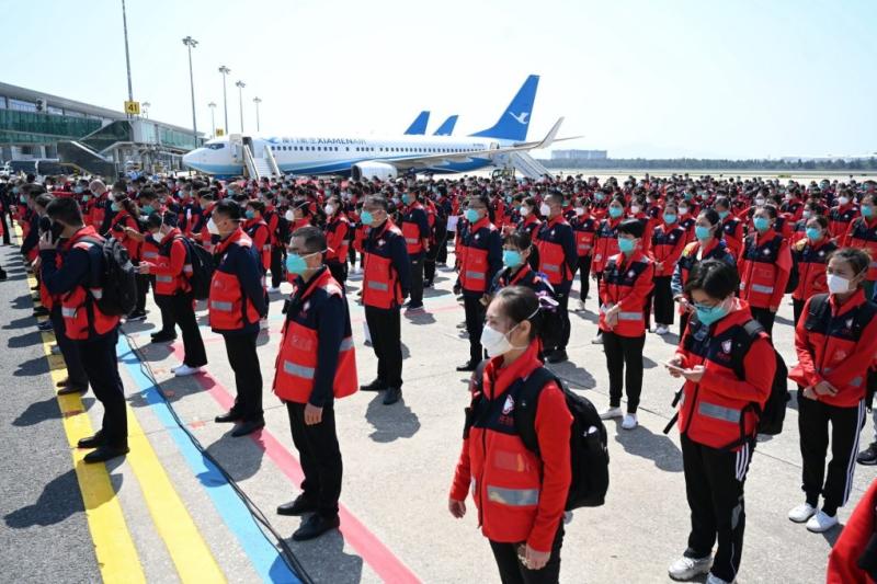 Nhân viên y tế tại sân bay Trường Lạc Phúc Châu ở tỉnh Phúc Kiến hôm 7/4, trước khi lên chuyến bay đến Thượng Hải hỗ trợ chống dịch. Ảnh: Xinhua.