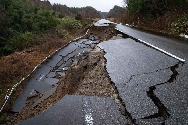Động đất gây hư hại đường sá ở Hakui, tỉnh Ishikawa, Nhật Bản, ngày 2.1.2024. Ảnh: Xinhua