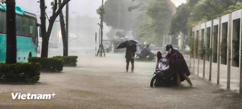 Nhiều tuyến đường phố của Hà Nội vẫn còn bị ngập sâu trong sáng 8/10. (Ảnh: Vietnam+)
