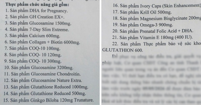 Quá trình điều tra xác định, các đối tượng đã sản xuất, buôn bán 22 loại thực phẩm chức năng giả, gồm các sản phẩm mang nhãn hiệu, tên gọi như: DHA for Pregnancy; GH Creation EX+; Glucosamine 1500mg; 7-Day Slim Extreme; Calcium 600mg; Collagen + Biotin 6000mg; COQ-10 (100mg, 120mg, 300mg); Glucosamine 3200mg; Glucosamine Chondroitin; Glucosamine Nature Extra; Glutathione Reduced (1000mg, 500mg); Ginkgo Biloba 120mg Trunature; Ivory Caps (Skin Enhancement); Krill Oil 500mg; Magnesium Bisglycinate 200mg; Omega-3 900mg; Prenatal Folic Acid + DHA; Vitamin E 180mg (400 IU) và sản phẩm Thực phẩm bảo vệ sức khỏe DR. LACIR – Viên nám Glutathion 600.