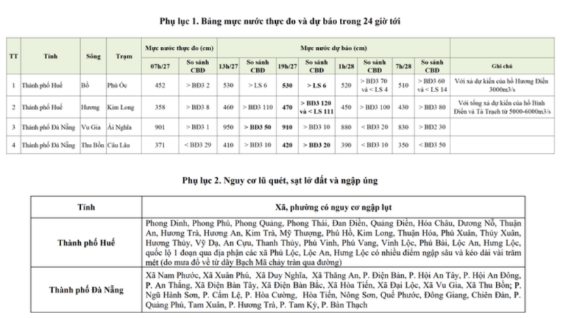 Dự báo mực nước lũ trên các sông ở Huế, Đà Nẵng và các xã phường có nguy cơ ngập lụt