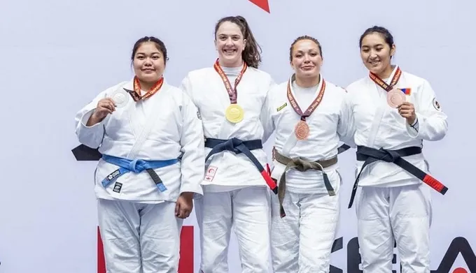 Tuyển thủ Thanh Trúc (ngoài cùng bên trái) là 1 trong những võ sĩ có nhiều kết quả huy chương ở giải thế giới 2025 đang tổ chức tại Thái Lan. Ảnh: WORLDJUJITSU