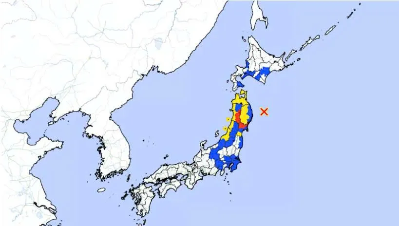 Bản đồ hiển thị tâm chấn và khu vực được cảnh báo sóng thần (Ảnh: Cơ quan Khí tượng Nhật Bản)