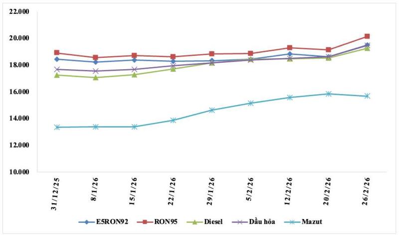 So với kỳ điều hành đầu tiên của năm - ngày 8.1.2026, đến ngày 26.2.2026, giá các mặt hàng xăng dầu đều tăng.