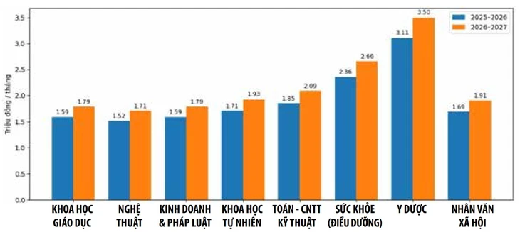 Học phí đại học theo lĩnh vực đào tạo (triệu đồng/tháng), so sánh năm học 2025-2026 và 2026-2027 - Nguồn: tổng hợp từ khung học phí do Chính phủ quy định - Đồ họa: TRẦN HUỲNH